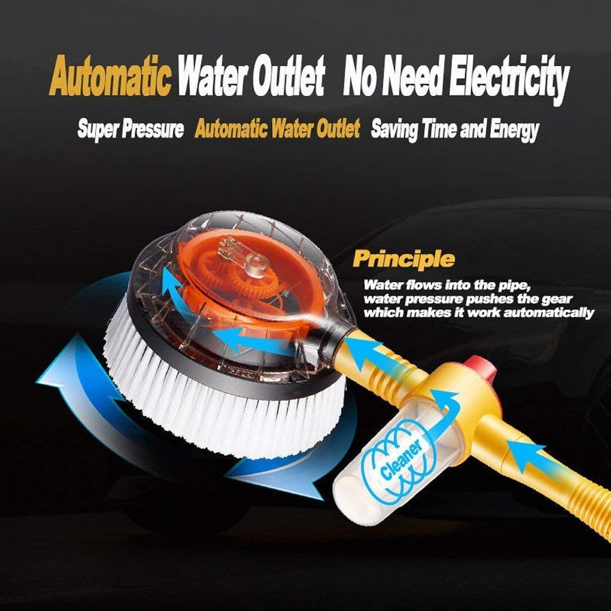 Under water pressure (from a hose), the brush head spins automatically in a full circle.