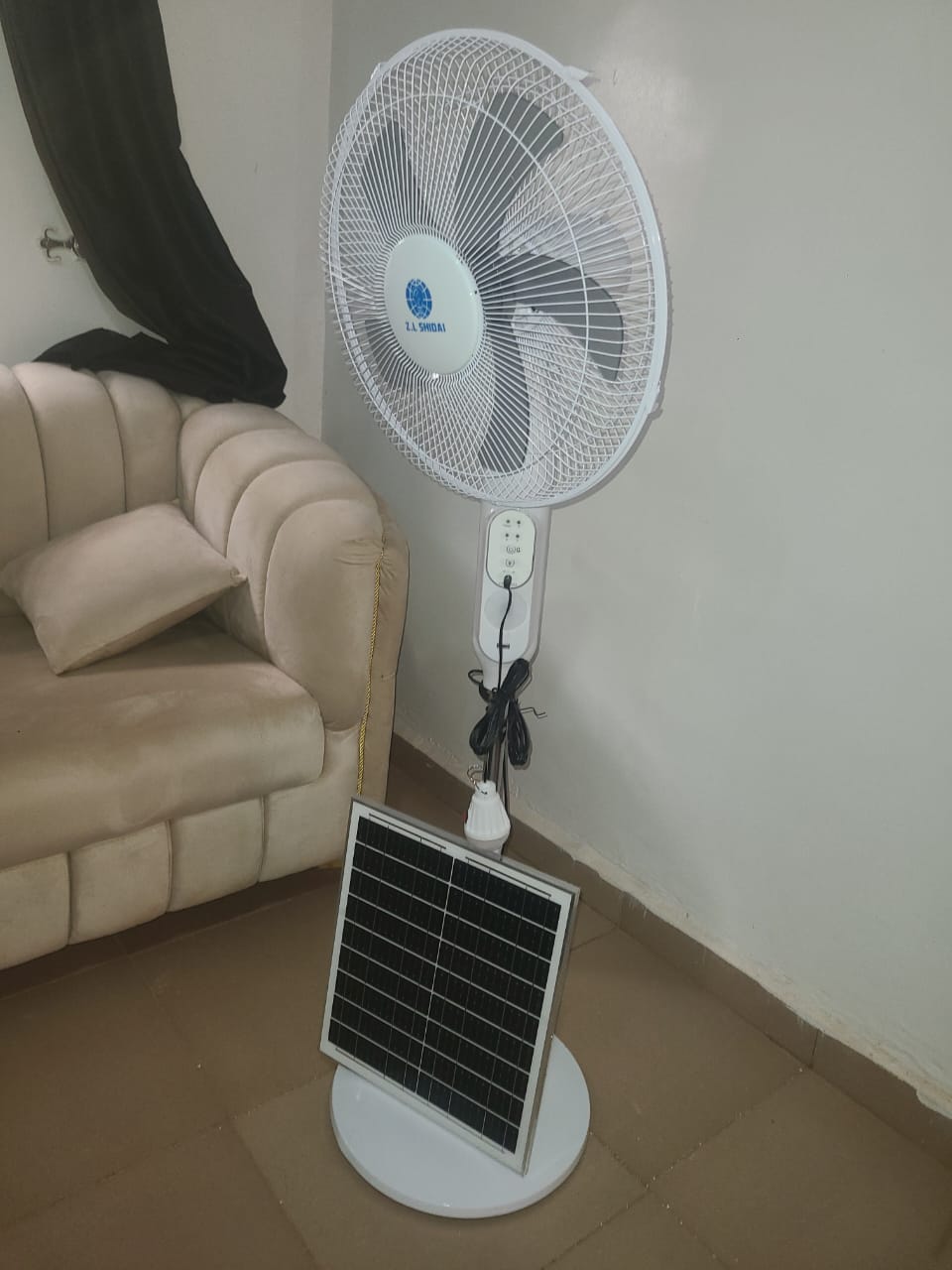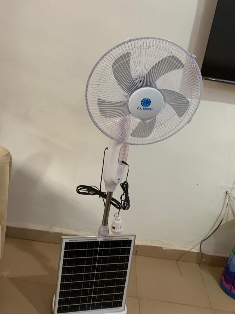 Solar standing fan with integrated lithium battery, solar panel and wall charger